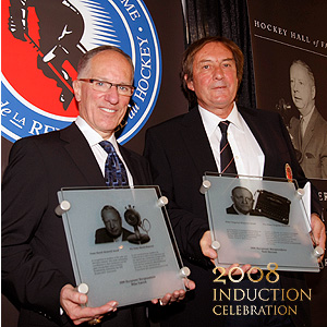 Mike 'Doc' Emrick (left) and Neil Stevens (right) graciously accept the Foster Hewitt and Elmer Ferguson Memorial Awards respectively. (Dave Sandford/HHOF/10Nov08)