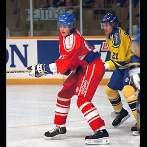 Czechoslovakia's Jaromir Jagr is hooked by Sweden's Borje Salming during the 1991 Canada Cup.